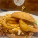 Beef Burger with Fried Cheddar, Onion Ring, Pickles and Mustard Aioli. Served with soup or fries $17++