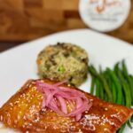 Teriyaky Glazed Salmon with Mushroom Fried Rice & Green Beans. $22.00 ++