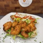 Fried Shrimp Po-Boy. Lemon Aioli, Greens & Tomatoes. Served with Soup or Fries. $17.00 ++
