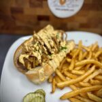 Bratwurst Sausage on a bun with Cabbage Mustard Aioli. Served with Soup or Fries. $15.00 ++