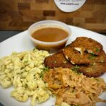 Pork Schnitzel with Fried Cheese, Spaetzle, Braised Cabbage & Tomato Gravy on the side. $18.00 ++